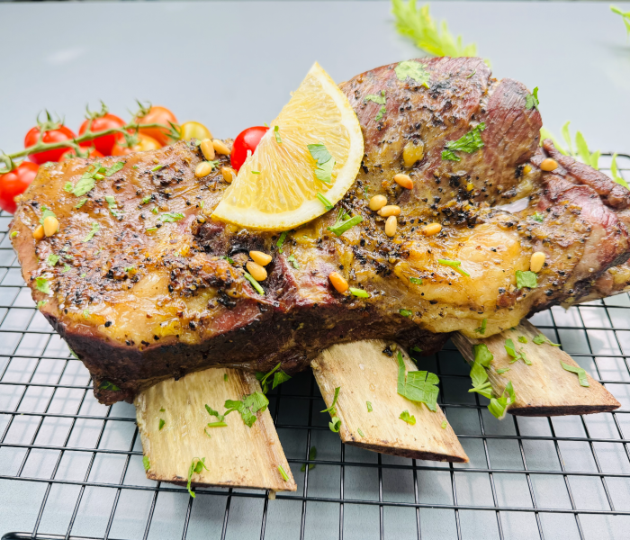 ندهن الاسادو في الزيت جيداً وبواسطة السكين نفتح فتحات صغيرة ونضع سنون الثوم . ونضع الروزمارين